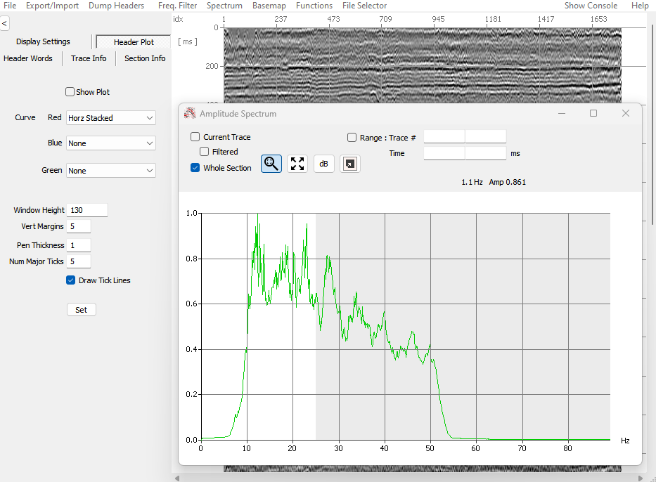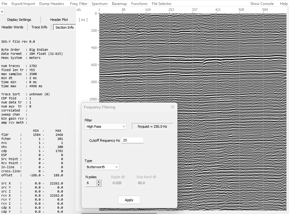 Although still under development, Geo2View already contains essential features such as filters, spectra, display customization, etc.! The tools included in the current version have been created to enable rapid visualization of seismic shot points and analysis of 2D sections. Other modules will be added in the near future.